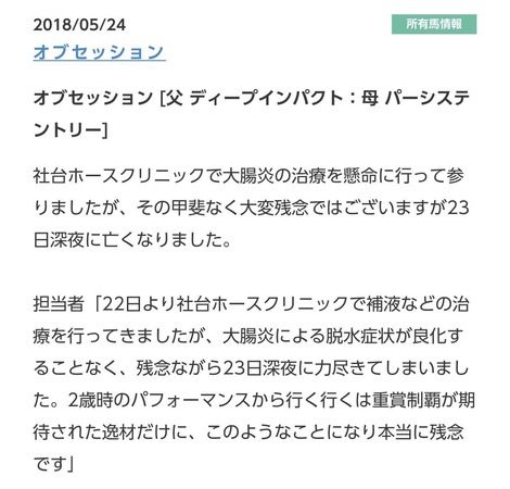 ゴスホークケン死亡で競馬板覗いたらオブセッション死亡スレが立ってた
