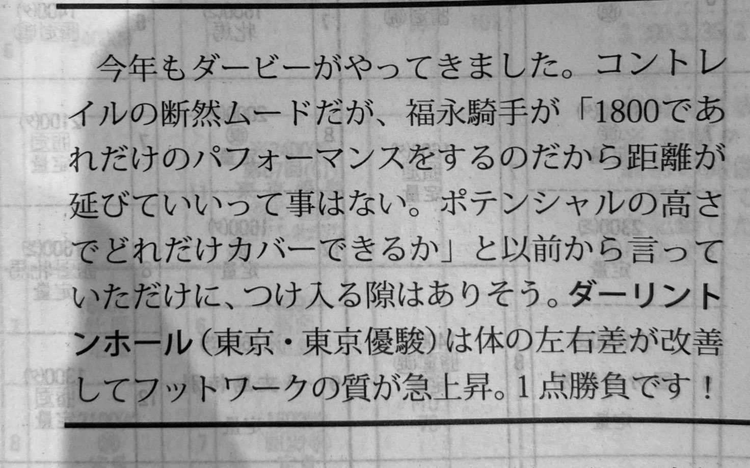 だが明日はスロー必至でかつ高速、上がりの速さ比べとなるはず。先週ほどではないにせよ、依然軽い芝なら、むしろプラスになるはずだ。圧倒的人気の馬を本命にするのは気が引けるが、ダービーだけは素直に打つ。