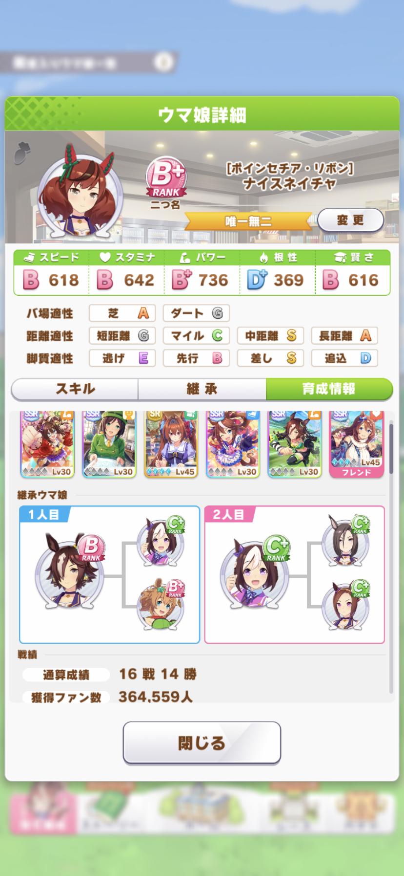 もしかしたら青因子はパラメータで抽選かかって良いステータスのとこの数値で星の数が増える確率上がってるとかもあるかもしれんけど、スピードSS+がいまんとこ5人スピード引いて星1が4人星2が1人やからワイはその説否定したいな