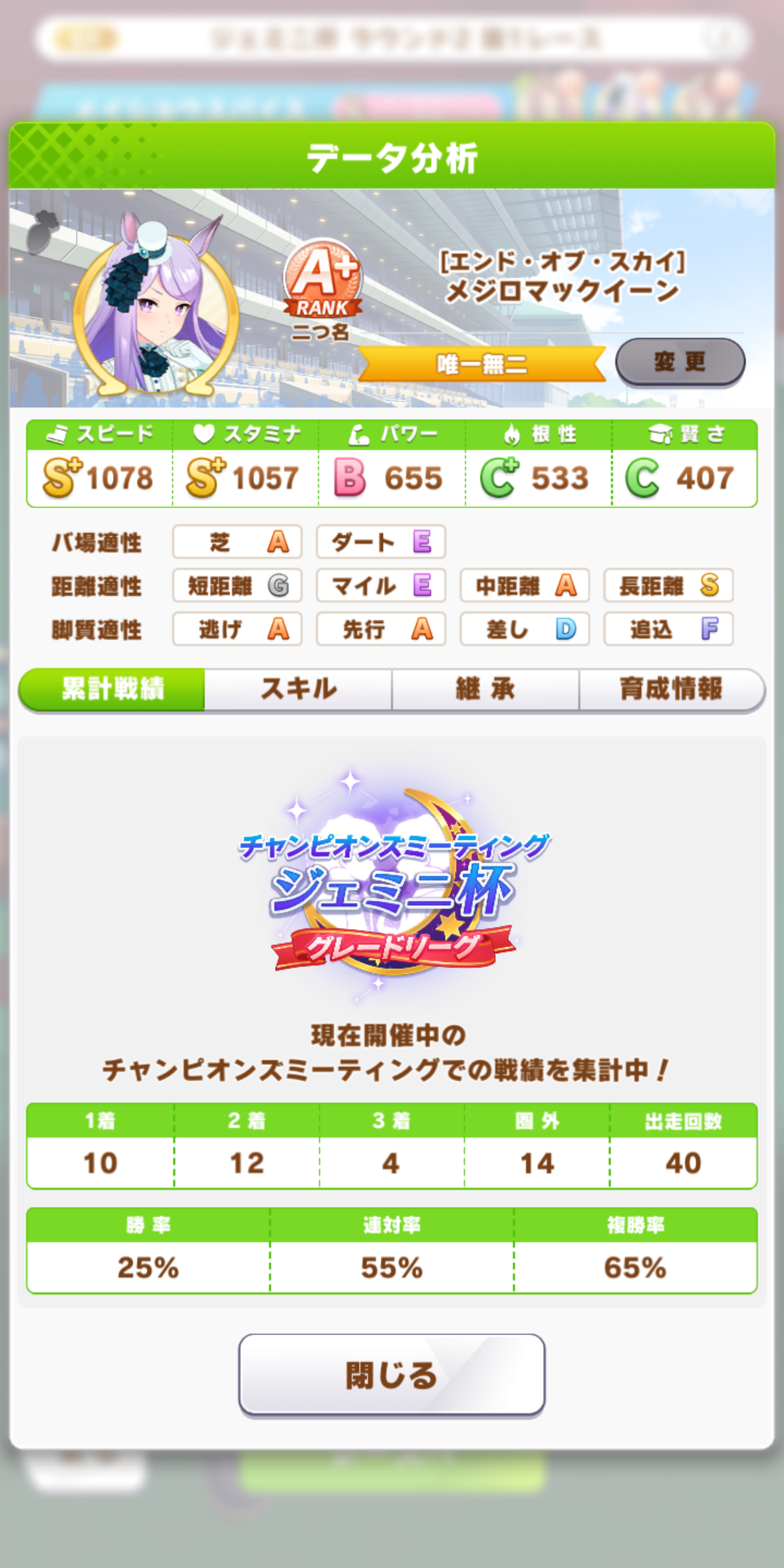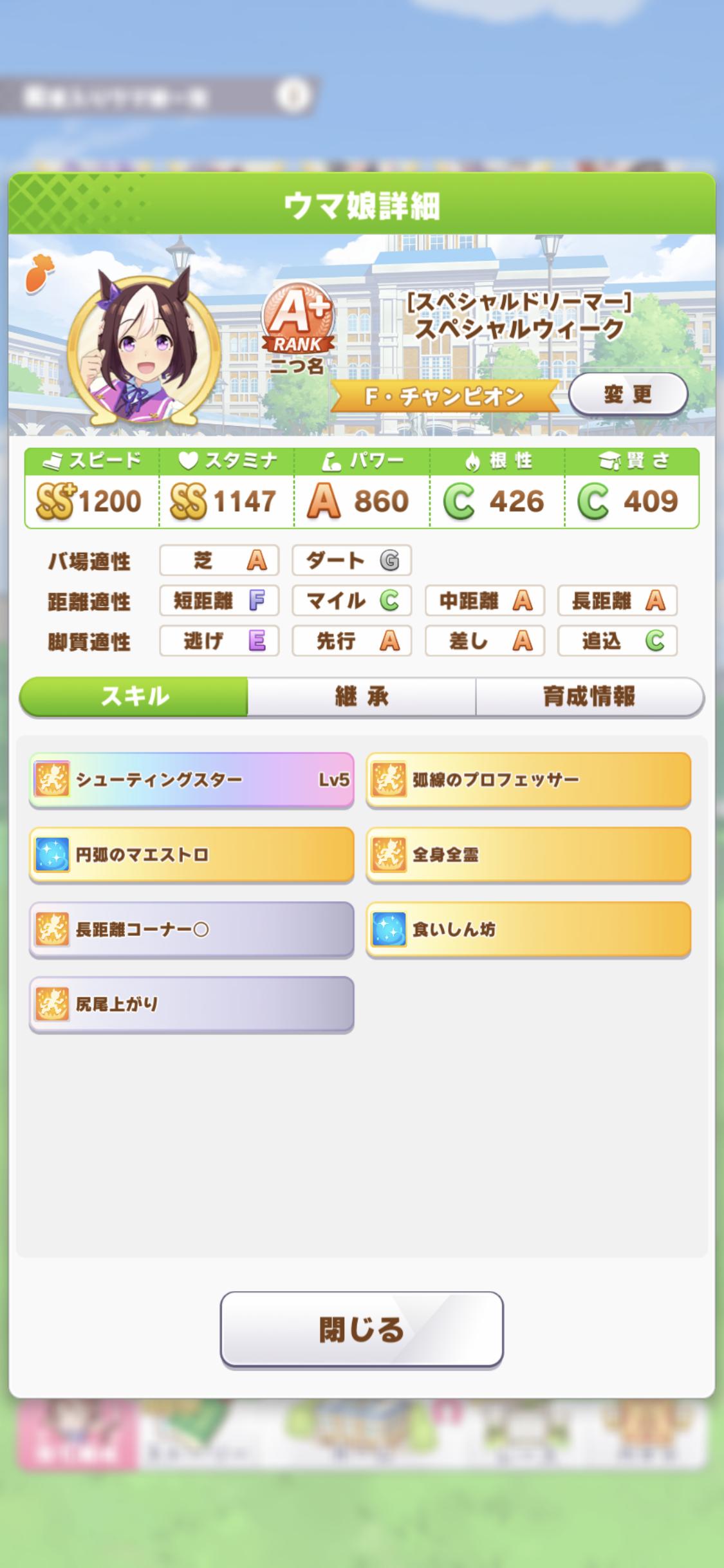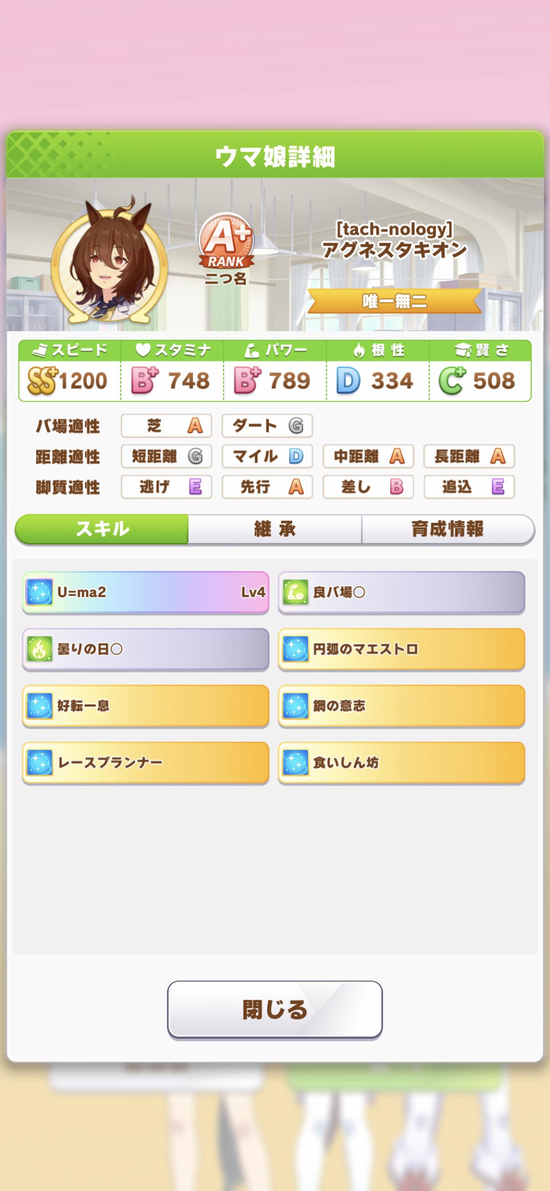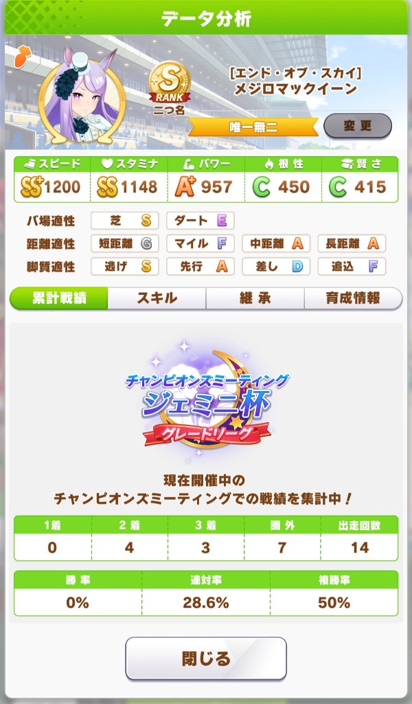 ワイのゴルシスピード950スタミナ1200でも勝ちまくっとるけどスピード1050スタミナ1200のナリブは負けまくっとるしよく分からん