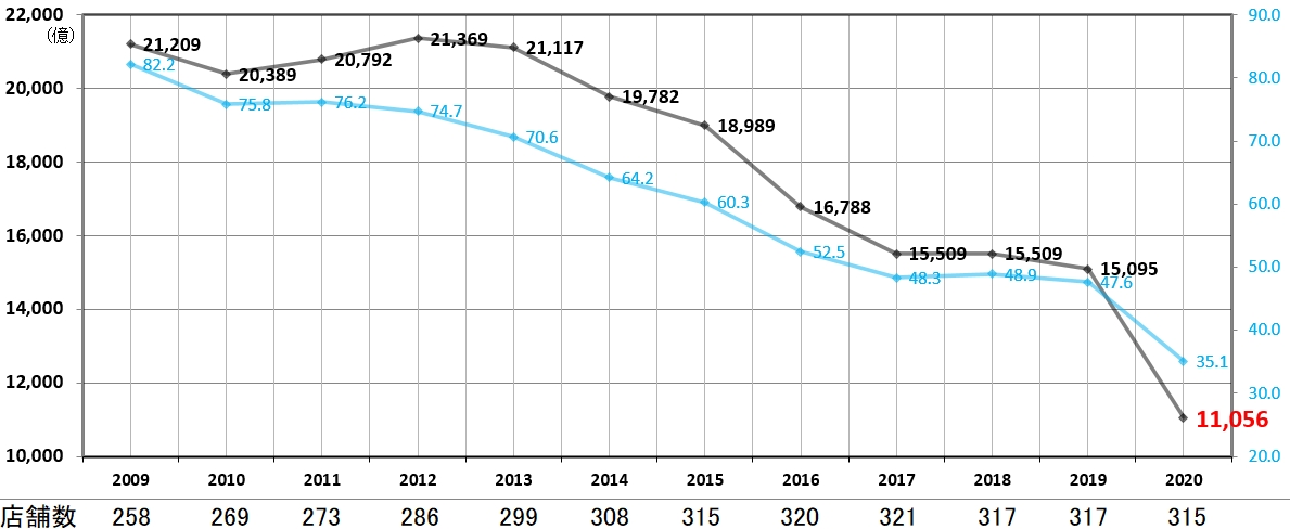 10年前と比較すると315%の圧倒的な売り上げで、バブル期すら上回りそう。