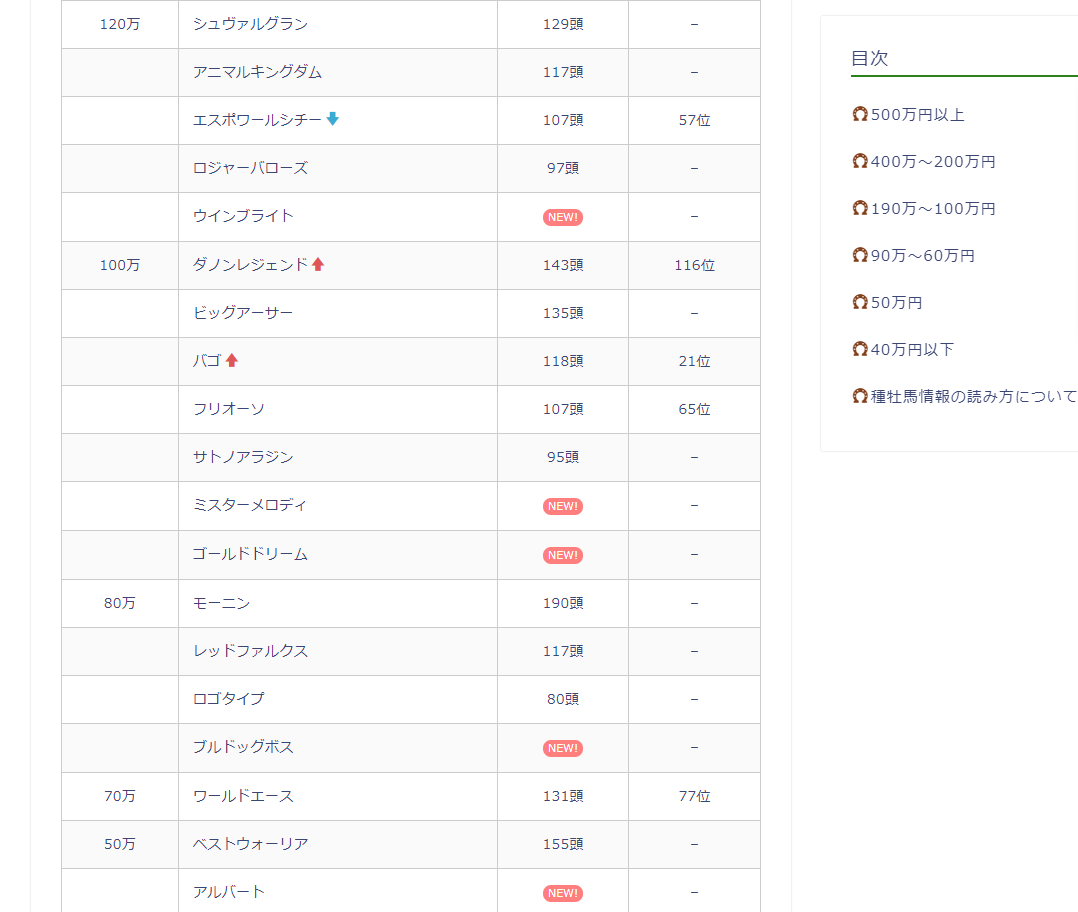 大物でないけど産駒の成績自体は安定してるダイワメジャーなんかずっと400~600万前後なのに対して距離適性が広いってだけで倍額すんのは高くない?って感じがするけど。
