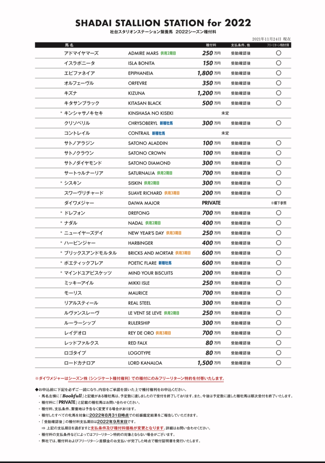 2021年度の社台スタリオンステーション繋養全種牡馬の種付料が決定いたしました。生産牧場・繁殖牝馬所有者の皆様、配合のご検討をよろしくお願いいたします。