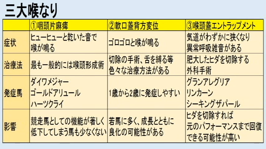実際は症状に関しては千差万別でなってても問題ない馬は多いし、手術は症状は治るけどその後競争能力が戻る馬はかなり少ないらしいが。