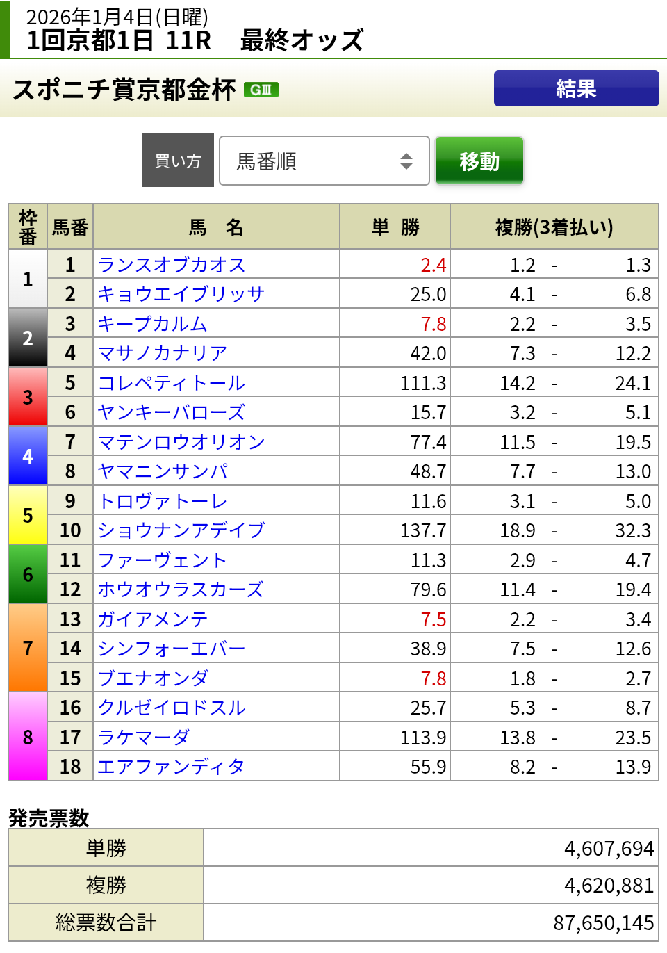 京都金杯の売上は87億。去年より10億増だって
