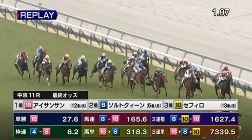 展開的に前残りしそうな馬に単勝1万ぶっこもうとして選んだのがソルトクイーンとカルプスペルシュで、最終的にオッズの高いカルプスペルシュ選んだから、直線は(ある意味)ドキドキした。いやあ、アイサンサンだったか・・・